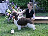 Tahiti stellte sich sehr gut an und stand der ganzen Sache ziemlich „cool“ gegenüber. Sie hat eine große Zukunft vor sich. Ihre erste Aussstellung war die Eastern English Springer Show in Warwick/Rhode Island und sie bekam ihr erstes Schleifchen für einen vierten Platz in der Offenen Klasse unter elf Hunden. Sie muss noch eine Menge lernen, aber dazu sind wir dort. In Springfield erreichte sie erneut einen vierten Platz und dann in Morristown erhielt sie in der Bred By-Klasse („Gezüchtet vom Aussteller“) zweimal 1/W/OS und jeweils einen Punkt. Nun haben wir schon zwei Punkte in Richtung unseres Championats. Es ist noch ein langer Weg, aber ich bin sehr stolz und glücklich.